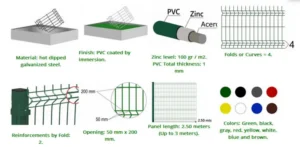 Due to the line welding processing, it has more firm structure and long lifetime. According to the material applied the fence is divide to Three CLASS.(CLASS1,2,3). The difference is the zinc rate.The Class 3 has the most heavy zinc rate so that it is better than the other two on corrosion.After the galvanized process then vinyl coating on the fence. This plastic layer provide a another protection to the fence and beautiful to look at.